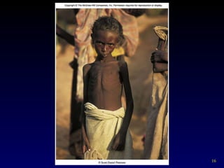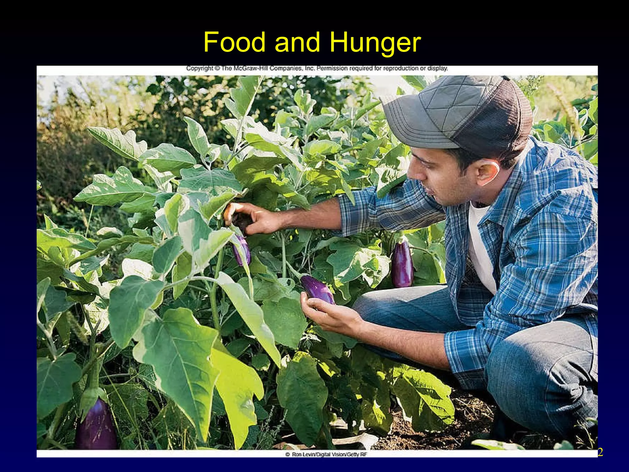 The document provides an overview of issues related to global food production and nutrition. It discusses topics like the green revolution, genetic engineering, meat production, key food sources, and policies around sustainable agriculture. While food supplies have increased with population growth, problems still exist like chronic hunger, overeating in developed nations, and the environmental impacts of intensive agriculture. The document advocates for more sustainable practices and policies that encourage local food production.