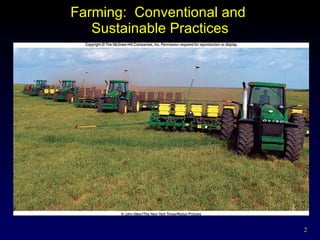 The document provides an overview of conventional and sustainable farming practices. It discusses several key topics: