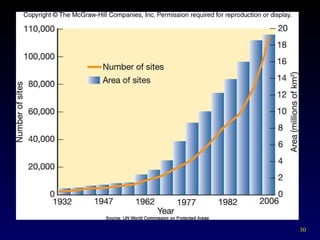 The document provides an outline of topics related to biodiversity and preserving landscapes. It discusses various types of forests around the world, threats to forests like deforestation, and efforts to protect forests through protected areas, conservation efforts, and sustainable land management practices. Grasslands, parks and preserves, marine ecosystems, and balancing conservation and development are also addressed.