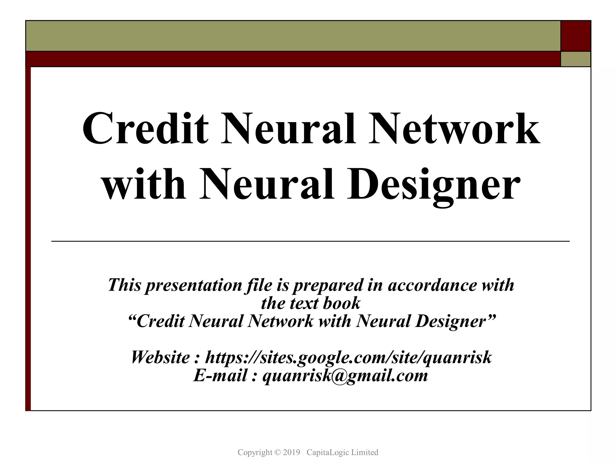 This document provides an overview of credit neural networks and their use in financial risk modeling. It discusses data preparation techniques, classical regression methods like linear and probit regression, monotonic neural networks, and continuous response neural networks. The key aspects covered are data cleaning, variable selection, network structure and training, and accuracy assessment for estimation and out-of-sample testing. The document aims to introduce neural networks as a tool for credit risk analysis and default prediction.