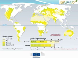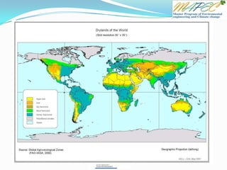 This document provides an overview of water resources and dryland environments. It discusses the global water cycle and how human activities have influenced water usage and scarcity. It also defines drylands based on factors like rainfall levels and vegetation. Drylands are categorized as either arid/semi-arid, where rainfall is the limiting factor, or wetter drylands where overgrazing can damage vegetation. Key characteristics of drylands are described related to natural resources, infrastructure, indigenous knowledge, lifestyles, mobility, and poverty levels.