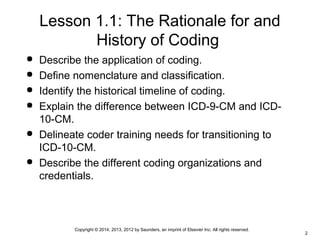 This document discusses the rationale for and history of medical coding. It covers the basics of coding including definitions of nomenclature and classification systems. The historical timeline of coding is reviewed, beginning in 1893 with Bertillon's system, and progressing to the current ICD-9 system used in the United States. Preparation for the upcoming transition to ICD-10 in 2014 is also addressed, including differences between the two systems and training needs for coders. The roles of various coding organizations are defined as well as common credentials for medical coders. Ethical standards, compliance, and confidentiality considerations are also summarized.