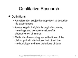 This document discusses qualitative research methods. It defines qualitative research as a systematic, subjective approach used to gain insights through life experiences and discover meanings. Qualitative research relies on inductive reasoning and is guided by philosophical perspectives like deductive logic, epistemology, and whether the approach is open-minded. Five common qualitative research approaches are described: phenomenology, grounded theory, ethnography, exploratory research, and historical research. Each has a philosophical orientation and makes a contribution to nursing science.