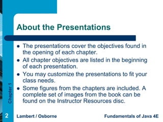 This document provides an overview of key concepts from Chapter 1 of the textbook "Fundamentals of Java: AP Computer Science Essentials, 4th Edition". It discusses the history of computers, computer hardware and software, binary representation of data, programming languages, the software development process, and basic concepts of object-oriented programming such as classes, objects, encapsulation, inheritance and polymorphism.