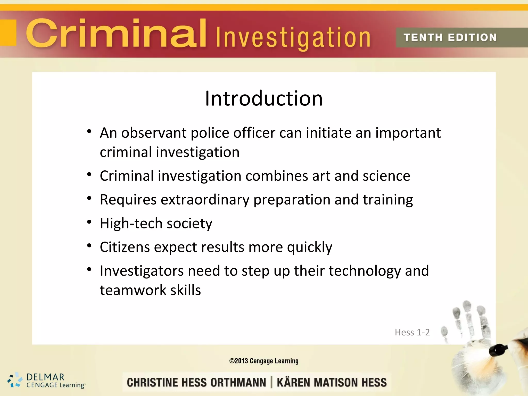 Criminal investigation involves both art and science. It requires obtaining evidence to identify suspects and determine if a crime has been committed. Effective criminal investigations require preparation, training, and the use of technology. Investigators must work with other law enforcement agencies and the community to solve crimes and present strong cases in court.