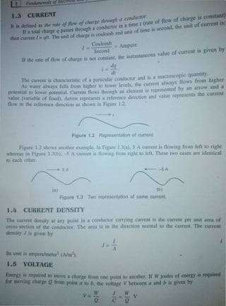 This chapter introduces basic electrical engineering terms and their units. It defines charge, current, drift velocity, current density, voltage, power, voltage drop/rise and basic circuit components. Current is defined as the rate of flow of charge through a conductor. The SI unit for current is the ampere. Current direction is indicated by an arrow and its magnitude by a number next to the arrow. Common multiples and sub-multiples of units are also presented.
