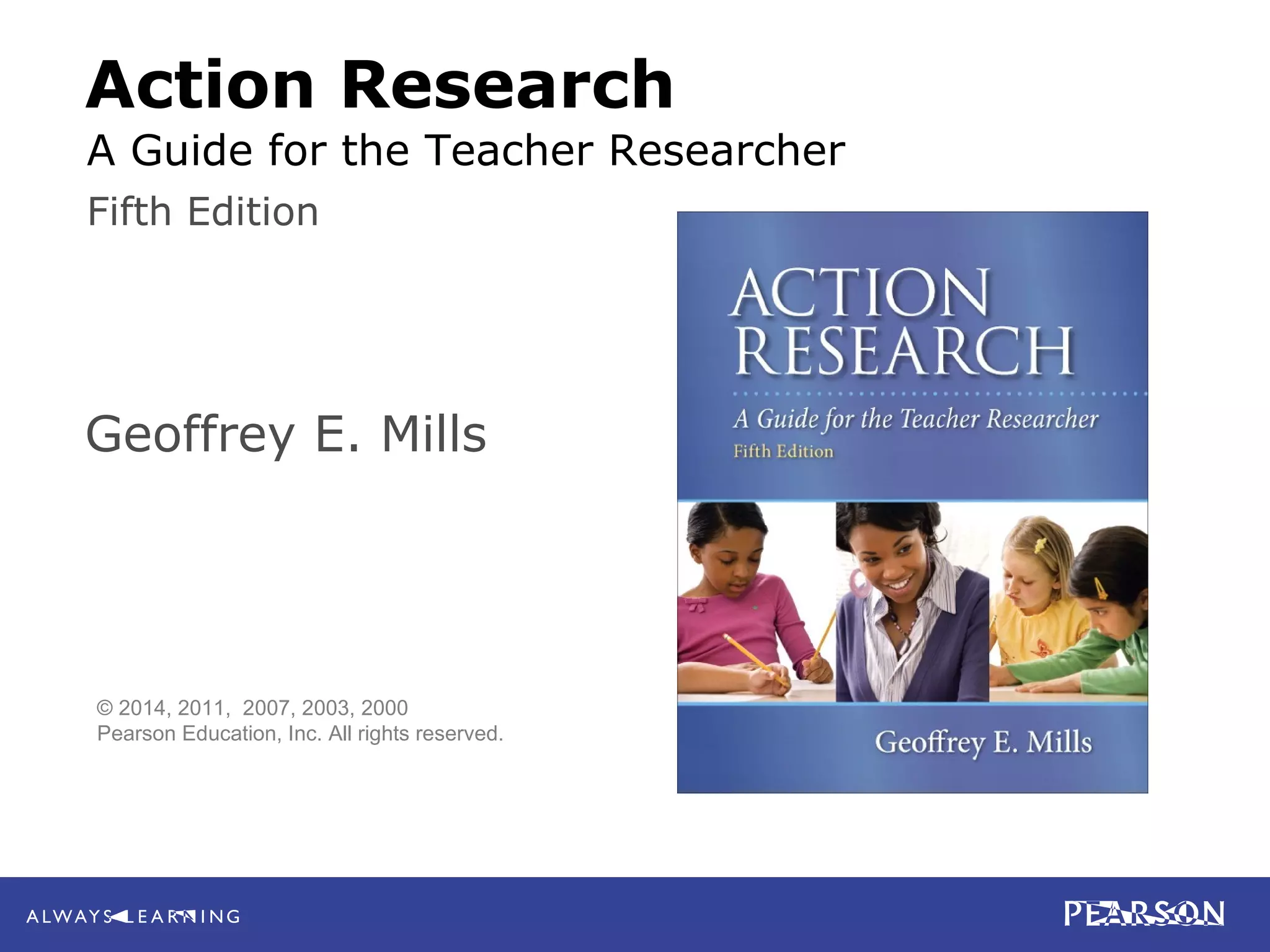 The document is an excerpt from the 5th edition of the book "Action Research: A Guide for the Teacher Researcher" by Geoffrey E. Mills. It introduces action research, discussing traditional educational research, quantitative research, qualitative research, and mixed-methods design. It then defines action research and covers its brief history, goals, and process.
