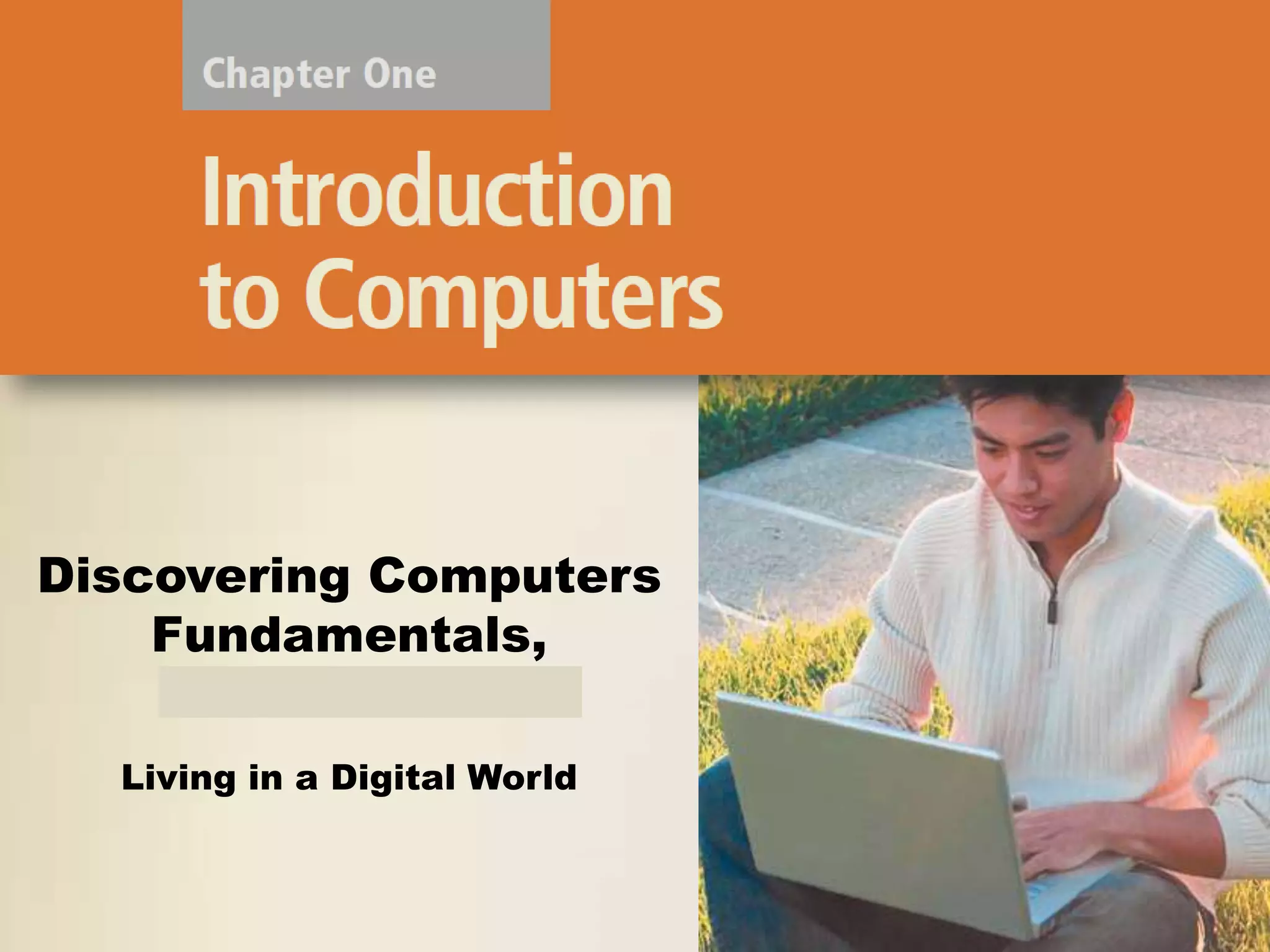 The document introduces concepts about computers including the five components of a computer, types of software, categories of computers from personal to supercomputers, and examples of computer usage by different types of users. It discusses how computers are used in various aspects of society such as education, finance, government, and manufacturing. The overall purpose is to explain why computer literacy is important and provide an overview of basic computer concepts.
