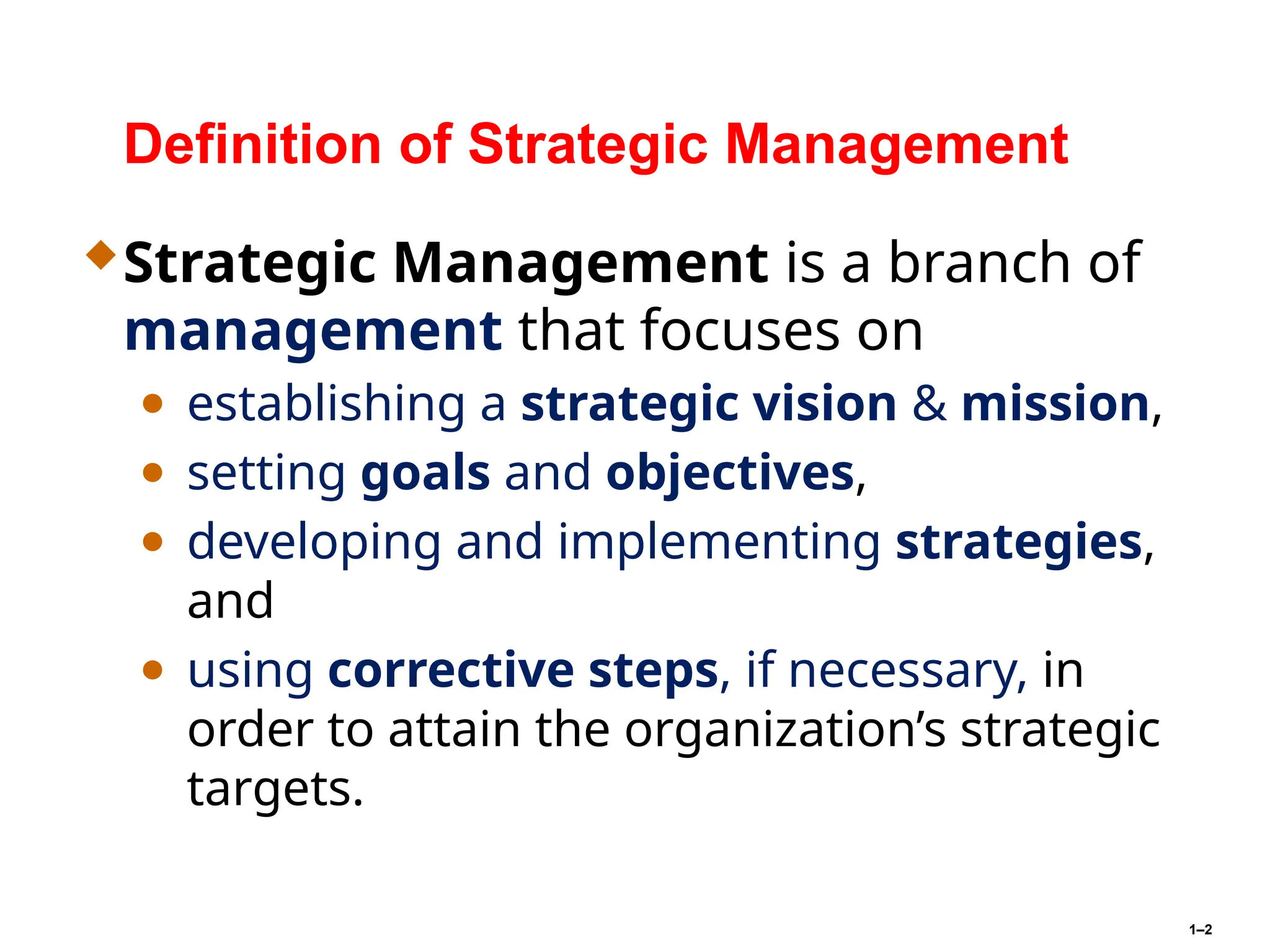 The document outlines the definition and importance of strategic management, emphasizing its role in establishing a vision, setting objectives, and crafting strategies to improve performance. It discusses why some companies succeed while others fail and highlights various aspects of strategy, including the quest for competitive advantage and the need for strategies to adapt over time. Additionally, it covers the elements of a business model and the strategic roles of different management levels within an organization.