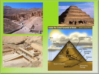 Unit 1 covers the origins of civilization from 8000-1500 BCE. It discusses the Stone Age and Agricultural Revolution that led to more settled communities. Mesopotamia was an early civilization that grew along the Tigris and Euphrates Rivers, developing cities, kings, trade networks, and advanced technologies like writing. Egyptian civilization also arose along the Nile River, with powerful pharaohs regarded as divine kings. Egyptians developed monumental architecture like pyramids, a bureaucracy to manage resources and taxes, and advanced knowledge in many fields like mathematics and astronomy.