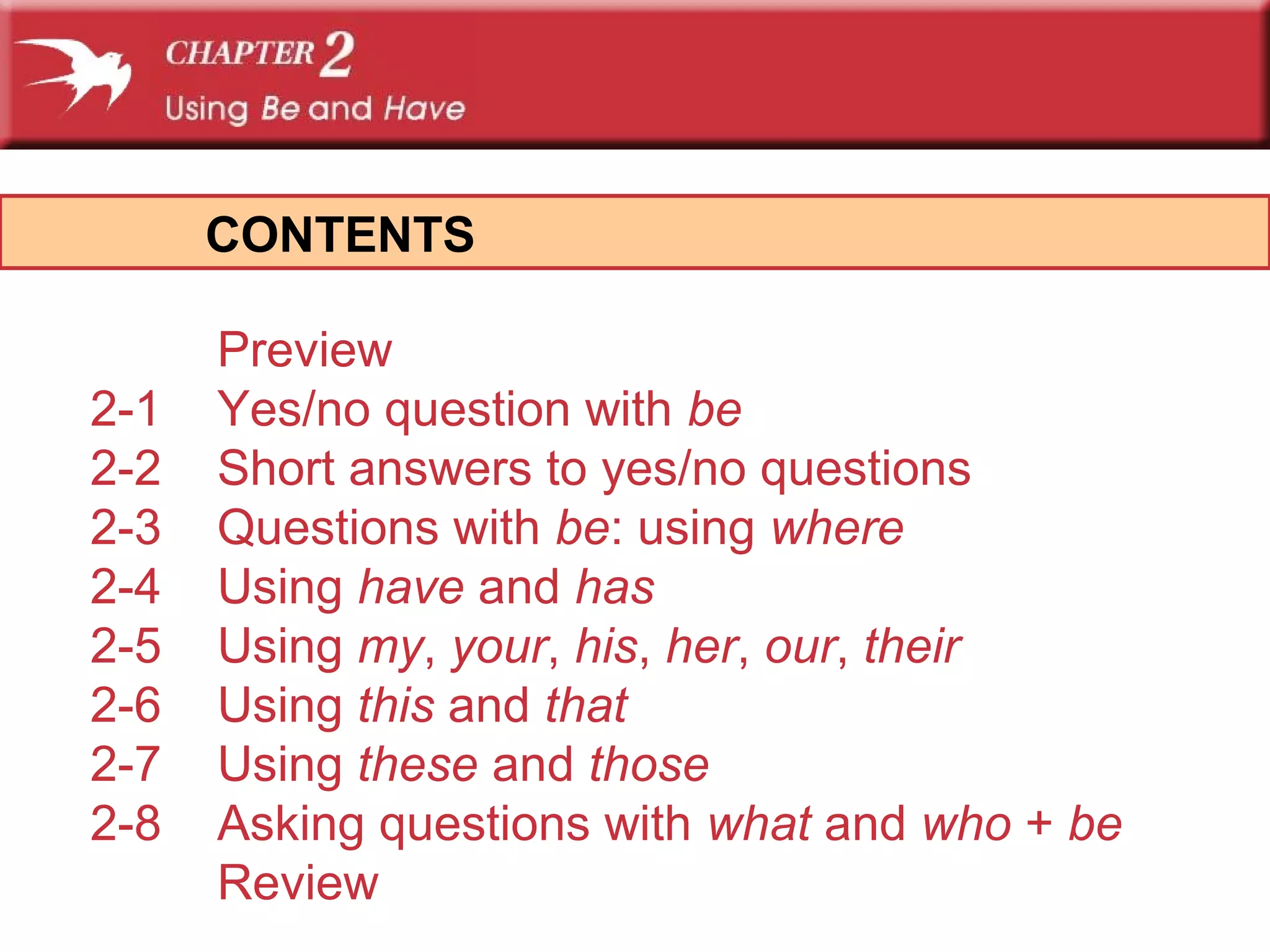 This document is a teacher resource for slideshows to accompany PowerPoint presentations on English grammar. It contains 8 chapters that provide examples of questions and statements using common linking verbs like "be", "have", and "is/are". Each chapter contains practice exercises. The final chapter reviews the key concepts from the previous chapters with additional exercises assessing the reader's understanding.