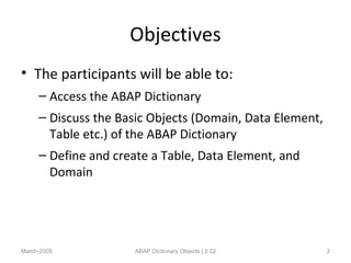This document discusses ABAP dictionary objects. It covers accessing the ABAP dictionary using transaction code SE11, the basic objects of tables, data elements, and domains. It provides instructions on defining and creating these objects, including defining domains with value tables to provide validation for fields.