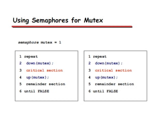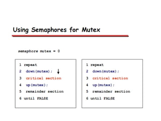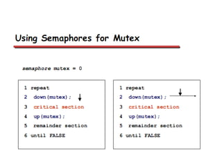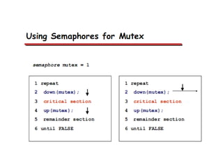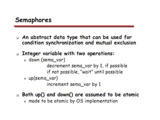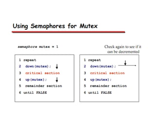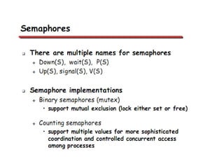This document discusses processes and threads. It covers topics such as process models with multiprocessing, process creation and termination, process hierarchies and states. It also discusses threads models, usage and implementations. Additionally, it covers interprocess communication including classical IPC problems, race conditions, mutual exclusion and solutions like Peterson's algorithm. It discusses the priority inversion problem and provides an example.