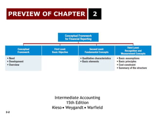 The document discusses the importance of a conceptual framework for financial reporting, emphasizing its role in establishing consistent standards and addressing emerging accounting issues. It outlines the Financial Accounting Standards Board's (FASB) efforts to develop this framework, detailing the objectives of financial reporting and the qualitative characteristics of accounting information. The text also covers basic accounting principles, assumptions, and the elements of financial statements, providing learning objectives for understanding these concepts.