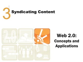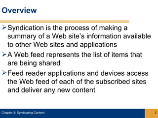 Syndication allows content from websites to be shared through web feeds. Web feeds represent lists of updated content items that can be accessed by feed readers and subscriber devices. Common types of syndicated content include blog posts, news headlines, job listings, and photos. RSS and Atom are popular formats for web feeds, which are written in XML. Podcasts are a type of web feed that distributes audio or video files.