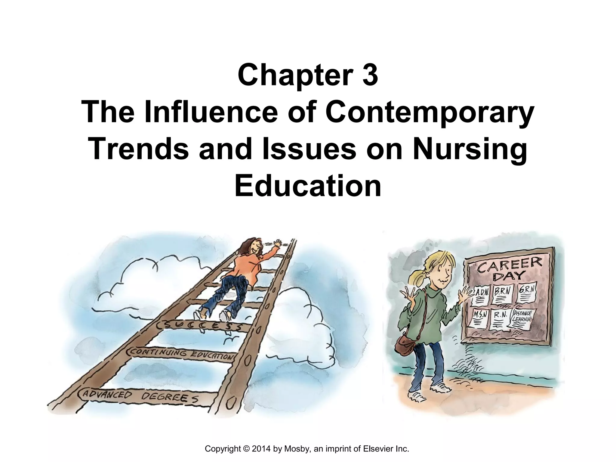 The document discusses several trends affecting contemporary nursing education. It notes that as information has expanded with technology, nursing students must learn to efficiently navigate vast online resources while managing heavy workloads. It also discusses a shift toward competency-based learning focused on practice outcomes, with evaluation based on performance-based exams and portfolios. Faculty are challenged to create interactive learning strategies and performance exams to help students develop skills like problem-solving, communication, and caring for diverse populations.