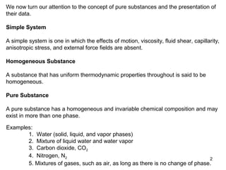 This document provides an overview of properties of pure substances and phase changes. It defines key concepts such as homogeneous substances, pure substances, and phases. It describes the pressure-volume-temperature surface and how substances behave differently if they contract or expand when freezing. Pressure-temperature diagrams are presented for substances like water. Property tables are included that provide thermodynamic data like enthalpy and entropy for different states like saturated liquid and vapor.