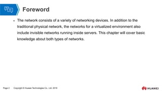 This document provides an overview of the network basics for cloud computing, focusing on both physical and virtual networks in virtualized environments. It covers essential topics including network architecture, physical devices, communication between virtual machines (VMs), and features of Huawei's virtualization products. The chapter concludes with a summary of the basic knowledge presented and includes recommendations for further learning resources.