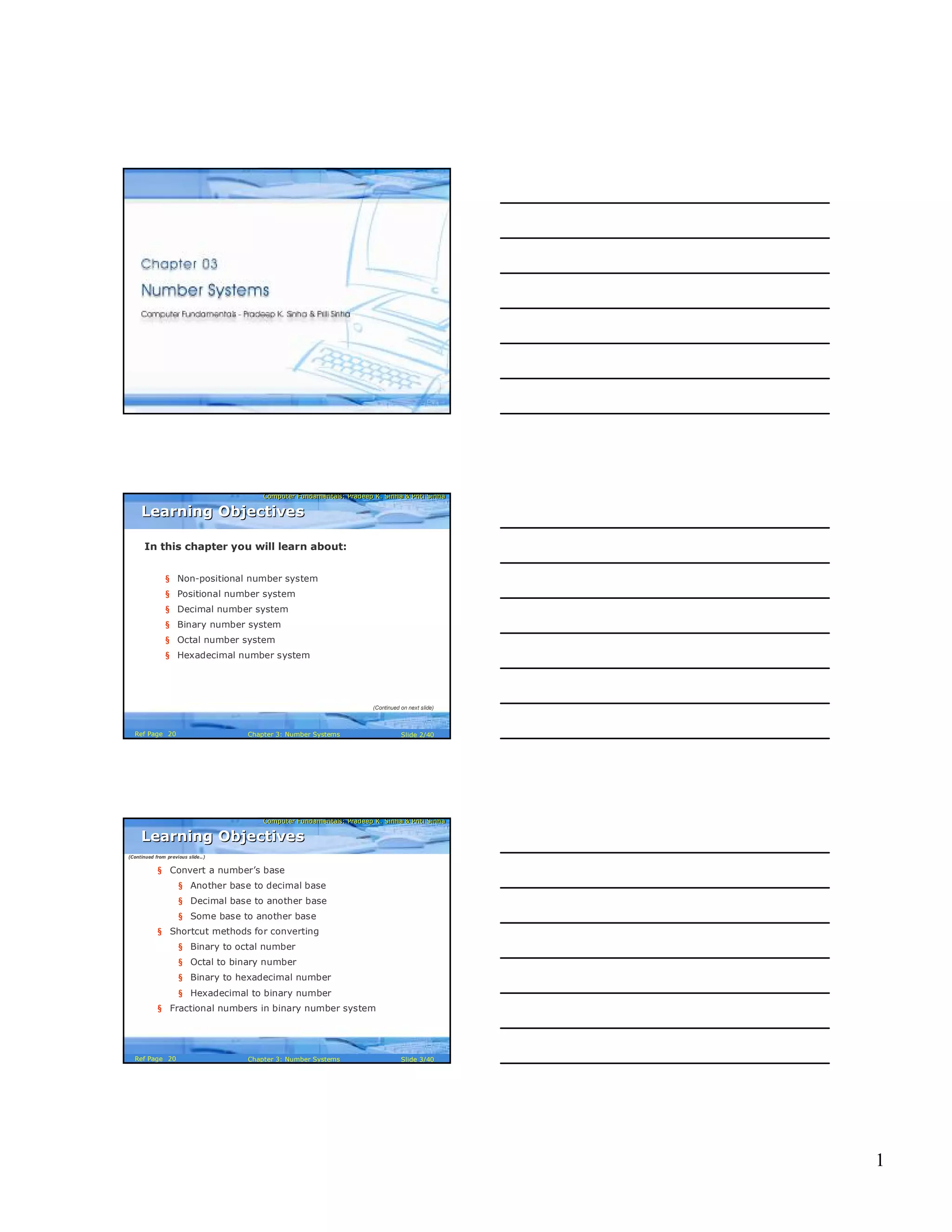 This document discusses different number systems including positional and non-positional systems. It covers the decimal, binary, octal, and hexadecimal number systems. The key topics covered include converting between these number systems using methods like determining place values or the division-remainder method. Examples are provided to demonstrate converting specific numbers between bases like binary, octal, decimal, and hexadecimal.