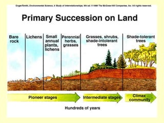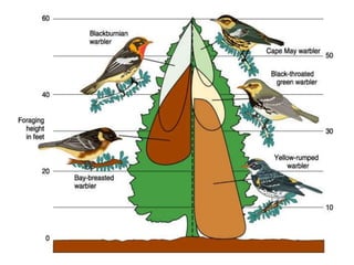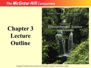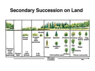 This document provides an outline and learning objectives for a chapter on populations, communities, and species interactions. It covers topics such as how species diversity arises, why species live in different locations, how species interact and affect one another's fate and community structure. It discusses concepts such as population growth, carrying capacity, competition, predation, symbiosis, adaptation, speciation, and community properties like productivity, diversity, complexity, and stability. Examples are provided to illustrate key points and terms.