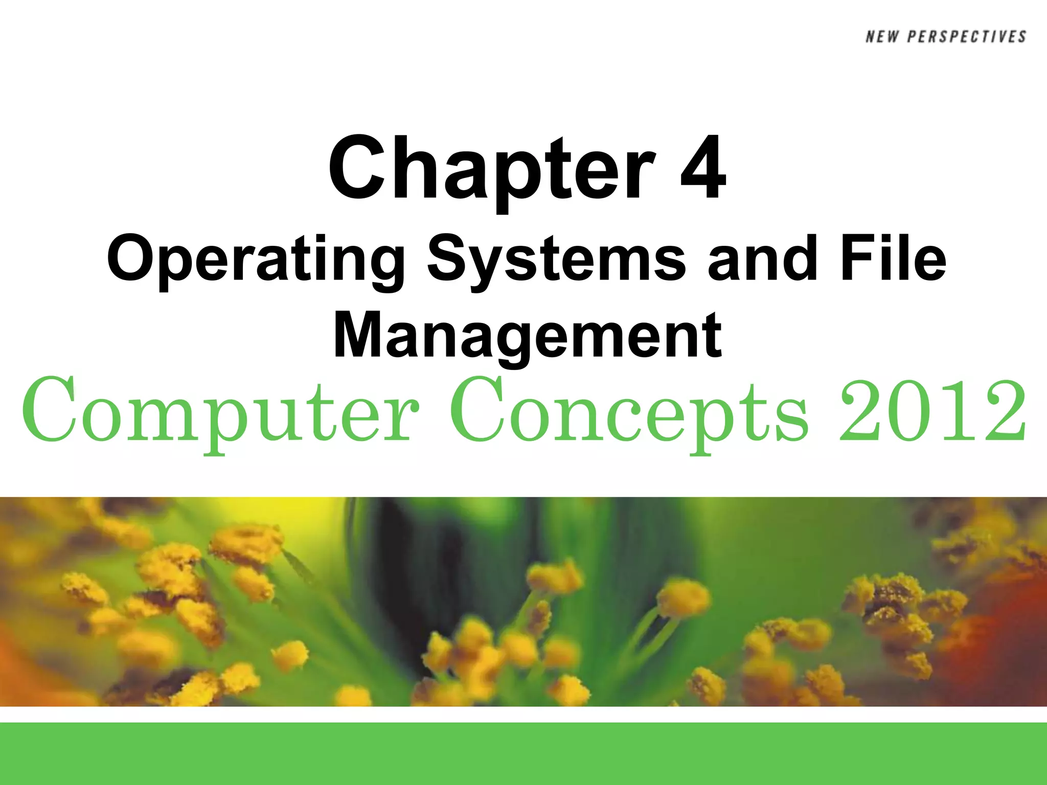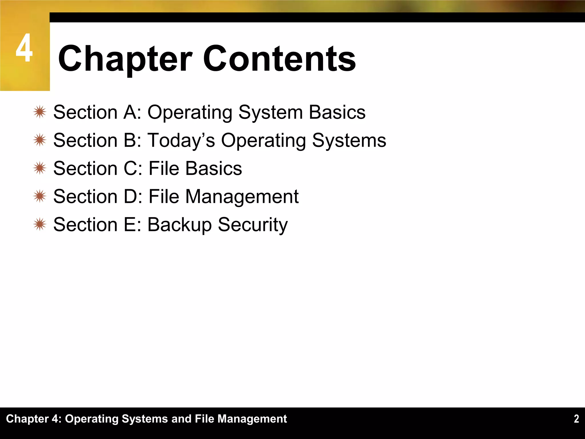 This document provides an overview of chapter 4 which covers operating systems and file management. It includes sections on operating system basics, popular modern operating systems like Windows, Mac OS, Linux and DOS. It also covers file basics such as names, extensions, directories and formats. The chapter contains explanations of concepts and true/false questions to test reader understanding.