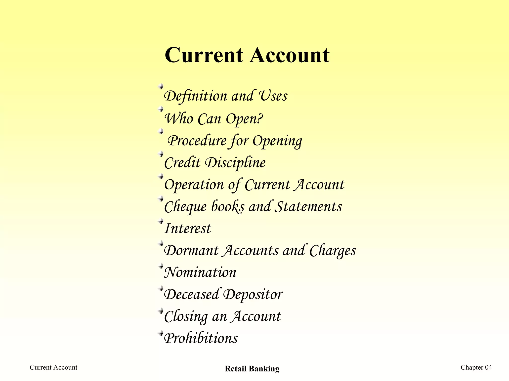A current account is a type of demand deposit primarily used for business purposes, allowing unlimited withdrawals within the account balance. Individuals, partnerships, and various organizations can open these accounts, which require identification and an introducer for security. Current accounts do not earn interest, may incur service charges if minimum balances are not maintained, and have specific operational rules, including nominations and processes for account closure.