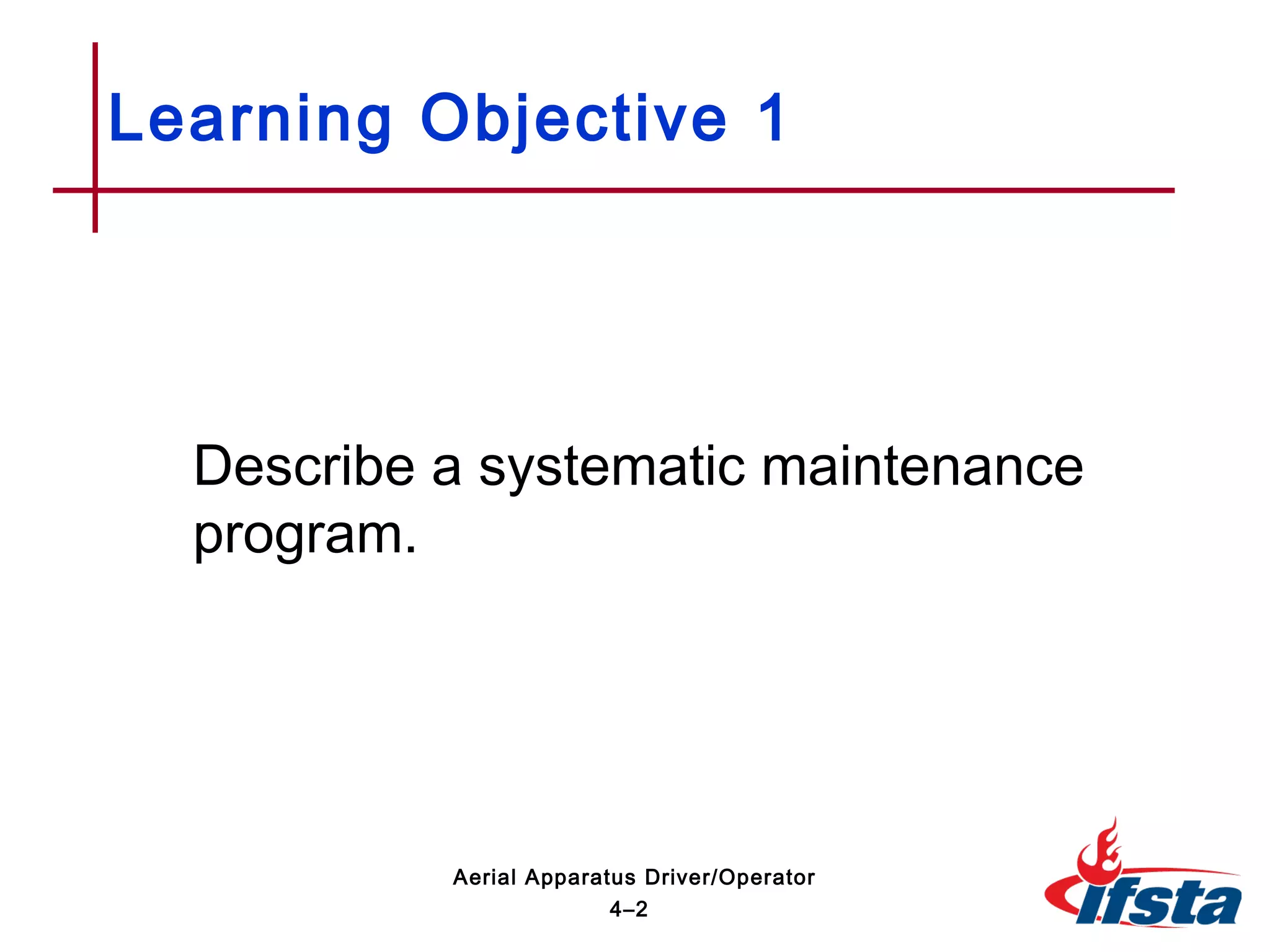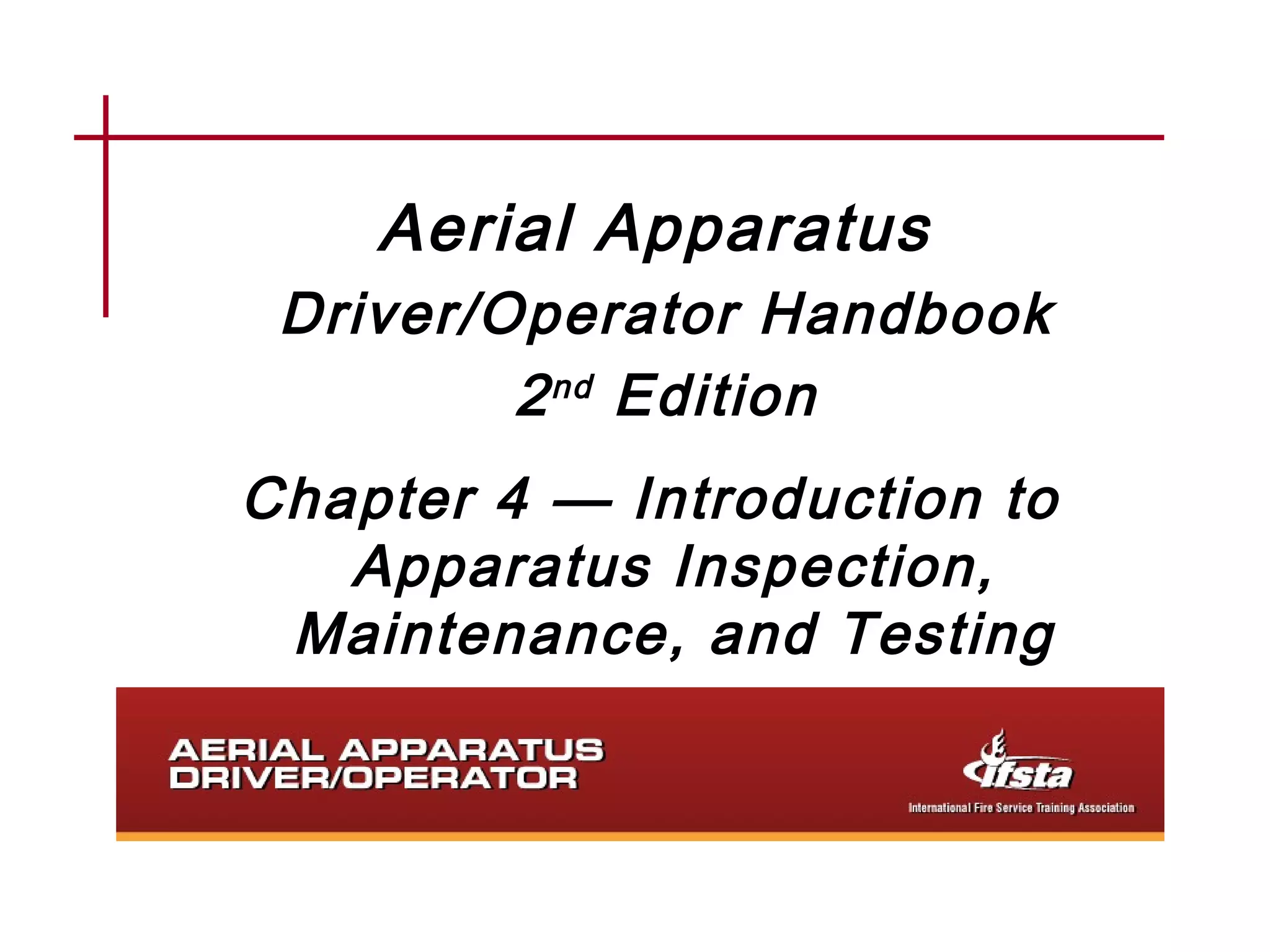 This chapter discusses inspection, maintenance, and testing procedures for aerial fire apparatus. It describes the importance of establishing a systematic maintenance program to dictate responsibilities. Proper procedures are outlined for inspecting and cleaning both the interior and exterior of the apparatus. The chapter also provides detailed guidance on performing walk-around, in-cab, and engine compartment inspections. Finally, it discusses various testing methods for aerial devices, including visual, operational, load, and nondestructive inspections.