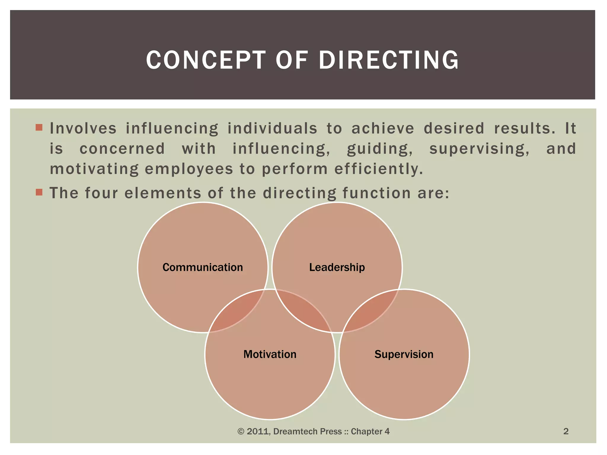 This document discusses key concepts in management functions including directing, personality, attitude, learning theories, perception, supervision, and motivation. It defines directing as influencing employees to perform efficiently through communication, motivation, leadership, and supervision. Personality is described as unique physical, mental and moral qualities. Attitude has cognitive, affective and behavioral components. Learning theories covered are behaviorism, cognitivism and constructivism. Perception involves receiving, selecting, organizing and interpreting sensory data. Supervision oversees subordinates' work through commanding, guiding and controlling. Motivation aims to improve employee performance and efficiency.