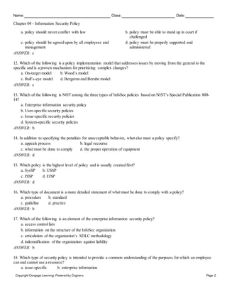 This document provides information about developing effective information security policies. It discusses key components of information security policies like specifying penalties for unacceptable behavior and including an appeals process. The document also covers different types of policies, such as enterprise, issue-specific, and system-specific policies. It emphasizes that policies must be properly developed, distributed, understood, agreed to, applied, and enforced to be effective.