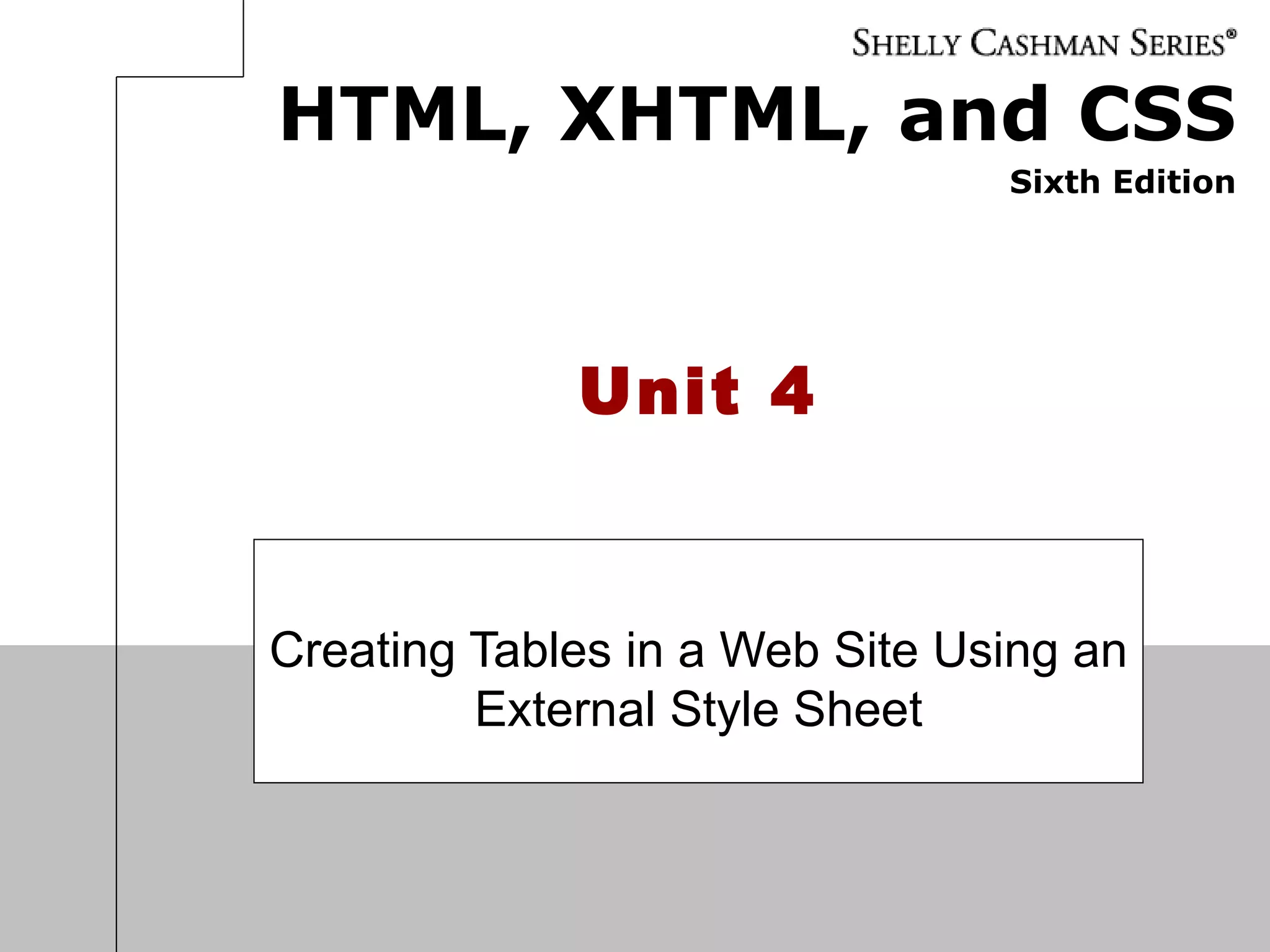 The document discusses creating tables in a website using an external style sheet. It covers defining table elements, creating a borderless table for a horizontal menu, linking an external style sheet to style pages, adding formatting to tables using cellspacing, cellpadding and other attributes, and validating HTML code.