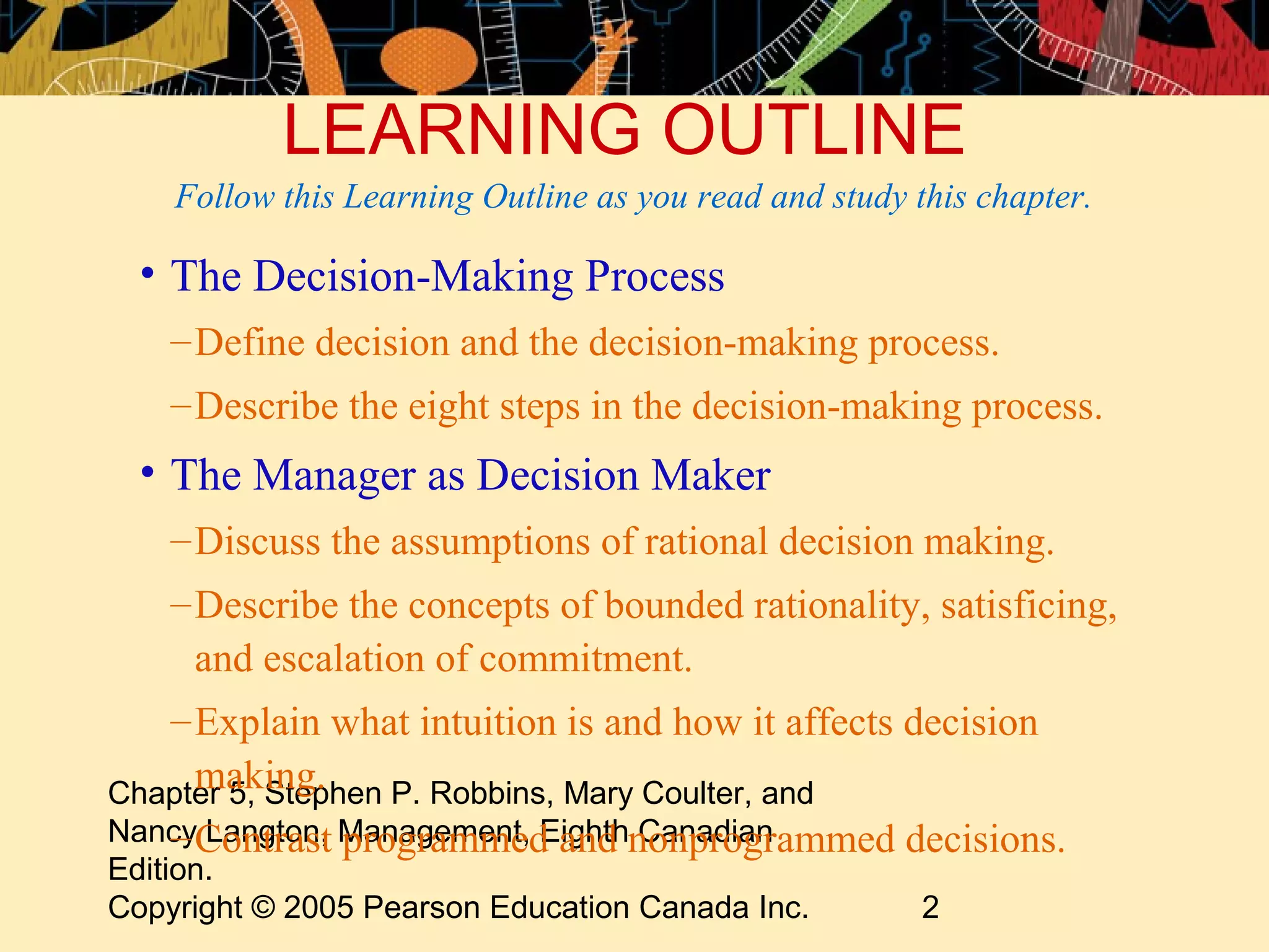 The document outlines the 8 step decision making process that managers follow: 1) Identify the problem, 2) Identify decision criteria, 3) Allocate weights to criteria, 4) Develop alternatives, 5) Analyze alternatives, 6) Select the best alternative, 7) Implement the selected alternative, and 8) Evaluate the effectiveness of the decision. It also discusses rational decision making and how managers can make effective decisions by following a process with characteristics like involving stakeholders and considering risks.