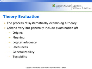 The document discusses various methods for evaluating nursing theories. It describes the three phases of theory evaluation as theory description, theory analysis, and theory evaluation. Several nursing scholars developed methods for theory evaluation, beginning in the 1960s. Their criteria examined aspects like origins, meaning, logical adequacy, usefulness, and testability. The document also presents a synthesized three-phase method for comprehensively evaluating nursing theories.