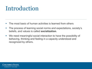 1) Socialization is the process of learning social norms, beliefs, and values from others through social interaction.