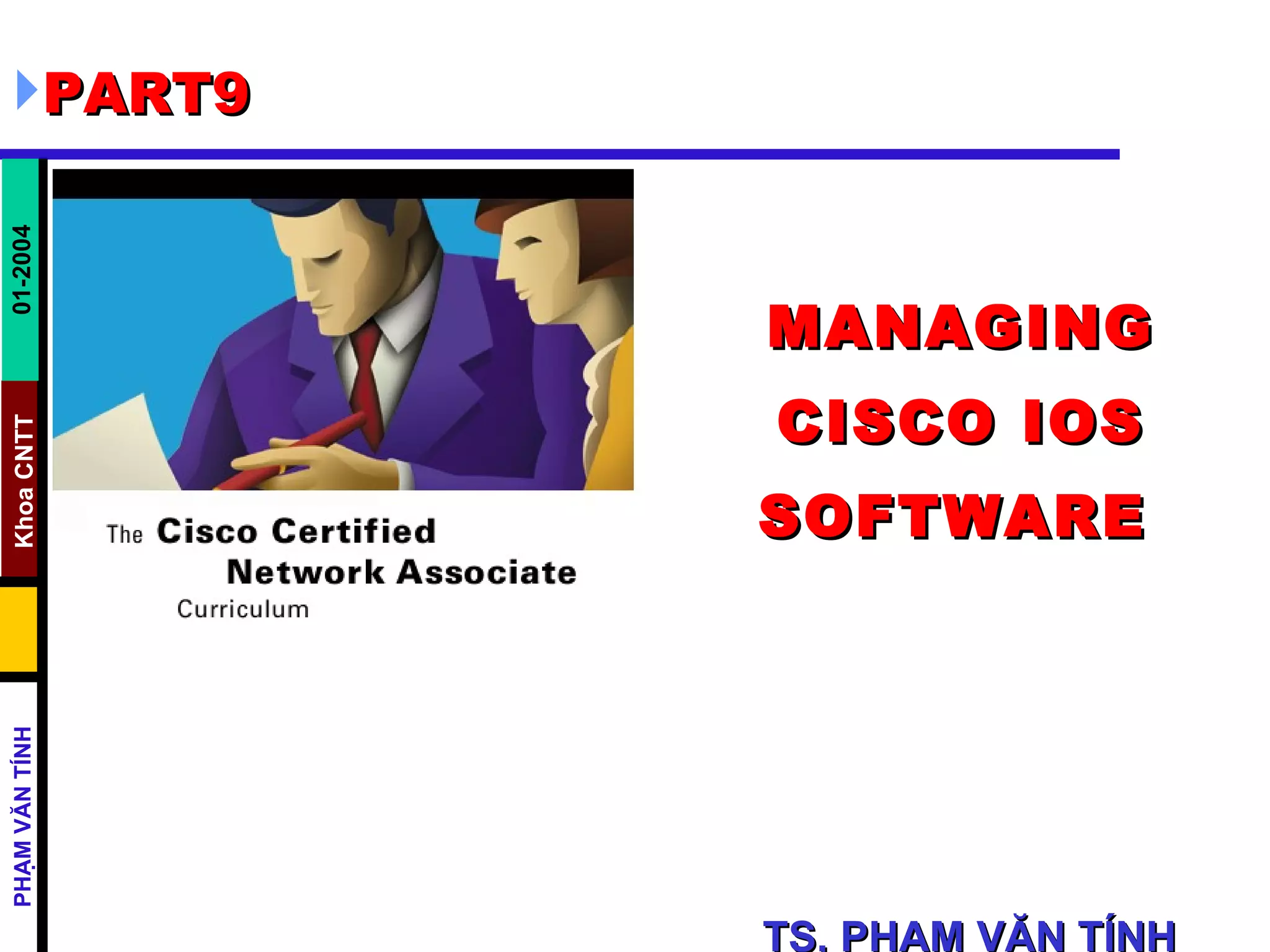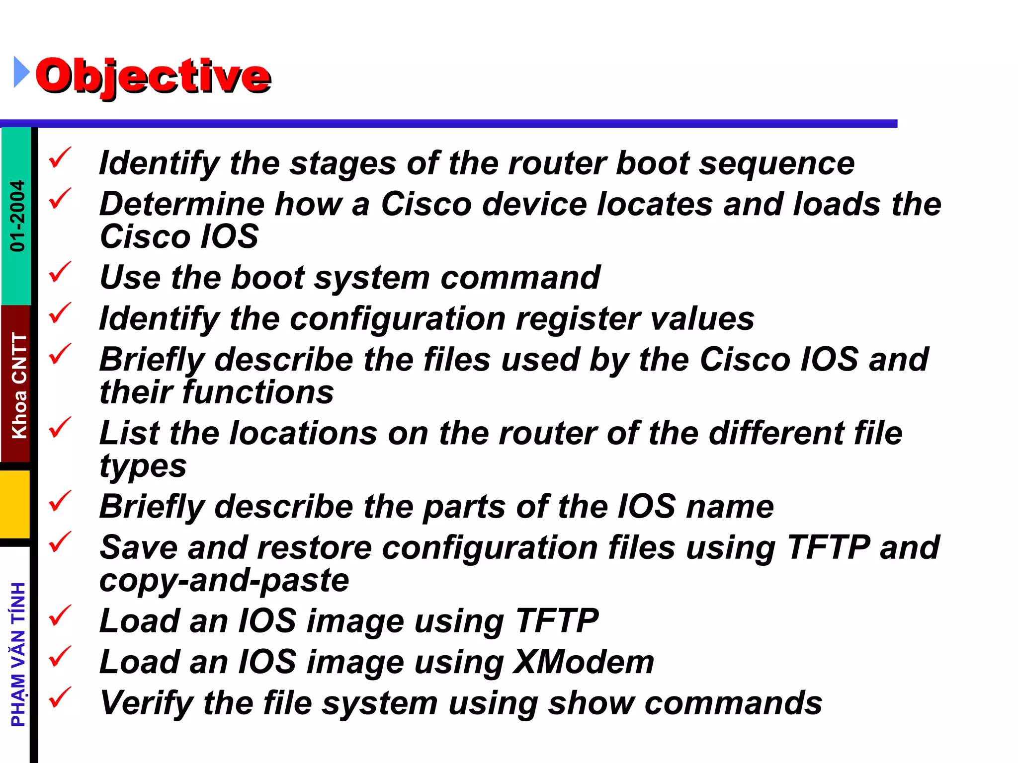 The document discusses managing Cisco IOS software. It covers the router boot sequence, locating and loading the IOS, configuration register values, IOS software components, managing configuration files using TFTP and copy/paste, and loading IOS images using TFTP and Xmodem. Environmental variables are used to download an IOS image from ROMmon mode using TFTP. The file system can be verified using show commands.