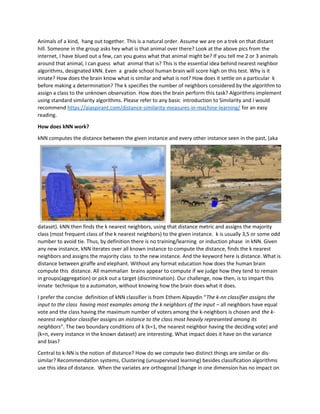 This document discusses the k-nearest neighbors (kNN) machine learning algorithm. kNN is a non-parametric, lazy learning algorithm that is used for classification problems. It works by finding the k training examples that are closest in distance to the new data point, and predicting the class based on the majority class among those k neighbors. The key aspects of kNN are that it requires calculating distances between all examples to make predictions, and has no explicit training phase, unlike parametric methods.