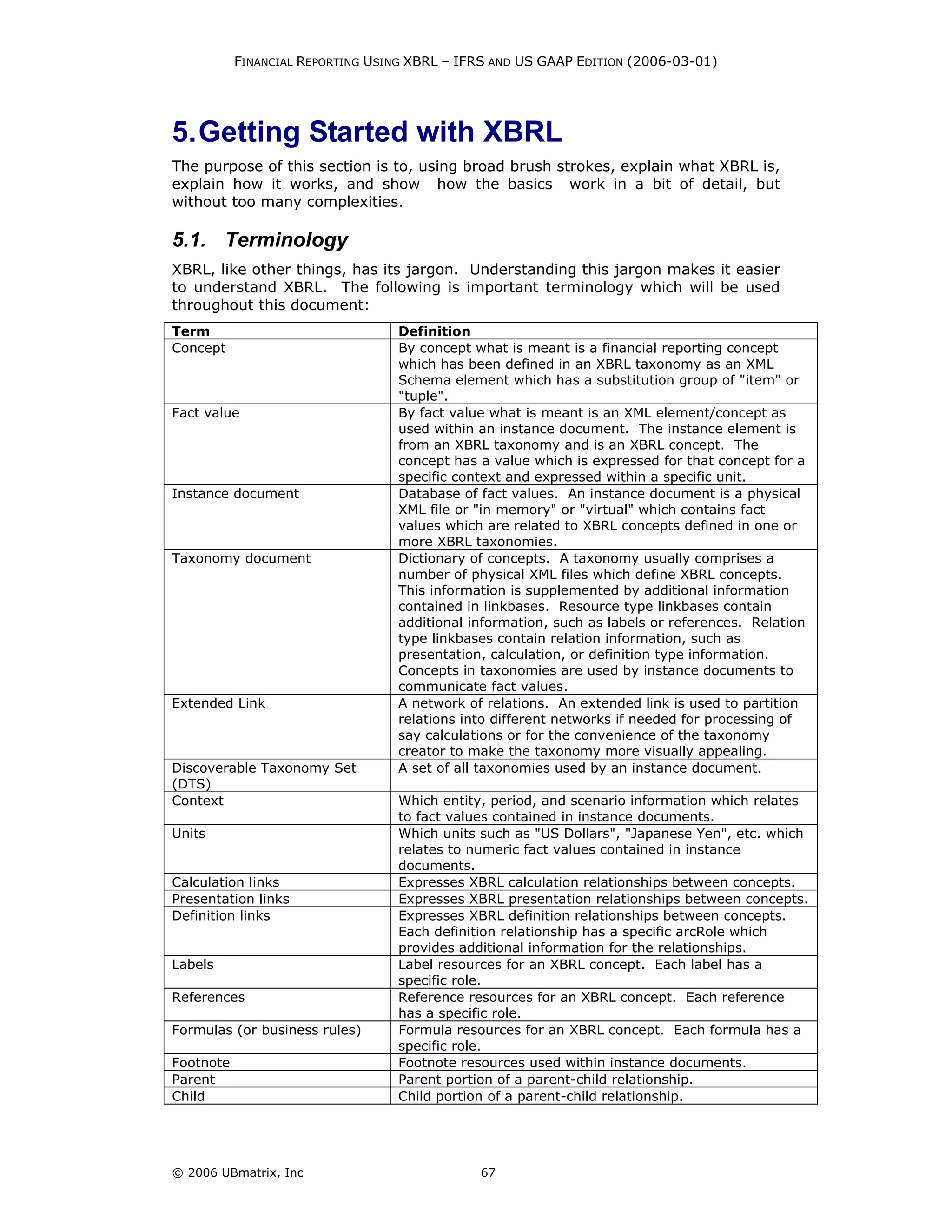 This document provides an overview of key concepts in XBRL (eXtensible Business Reporting Language), which is a standard for electronic communication of business and financial data. It defines terminology used in XBRL and explains how taxonomies define financial reporting concepts and how instance documents contain fact values that use these concepts. Taxonomies and instance documents are structured using XML.
