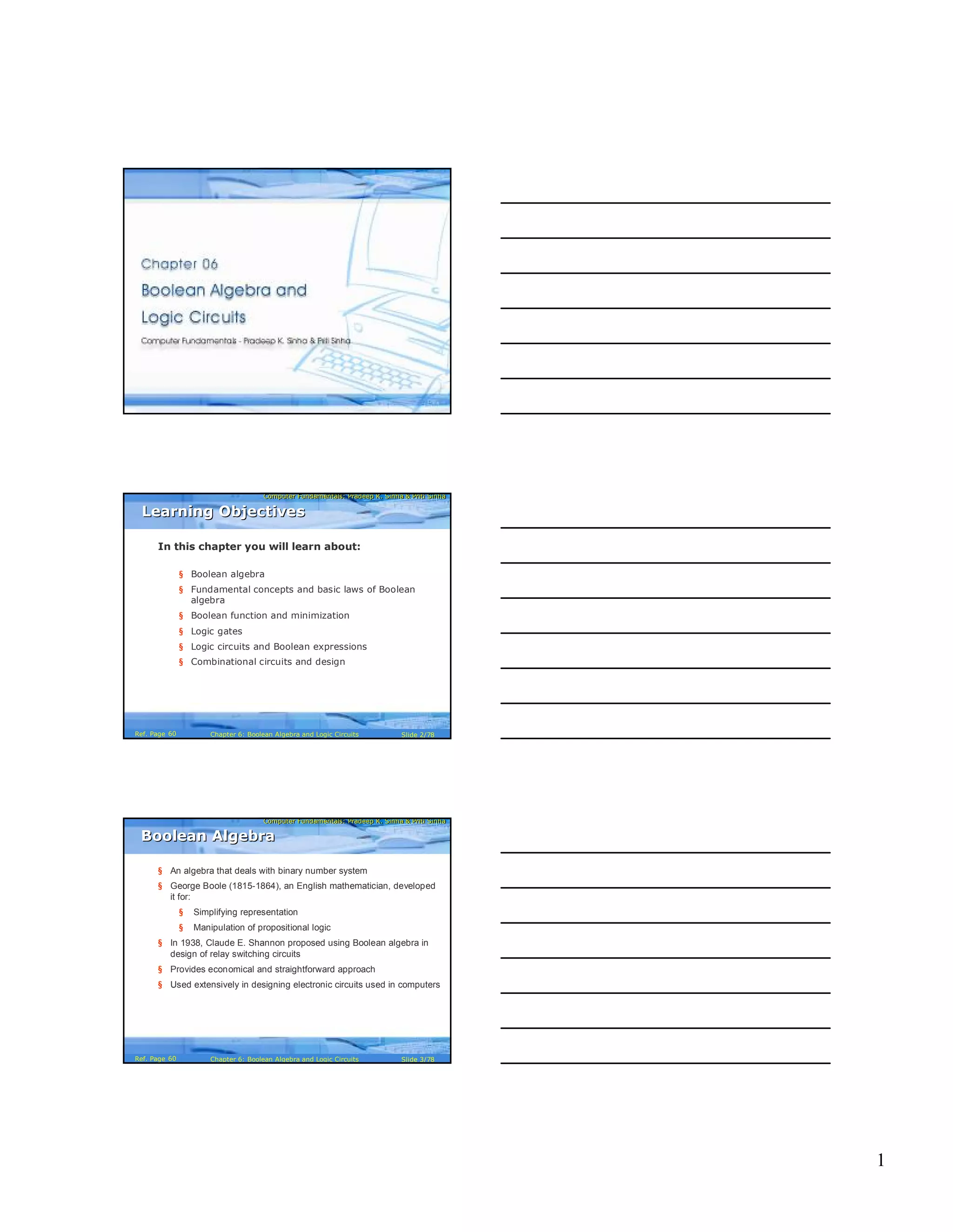 - The document discusses Boolean algebra and logic circuits. It covers Boolean algebra fundamentals such as binary operations, laws, theorems and their proofs.