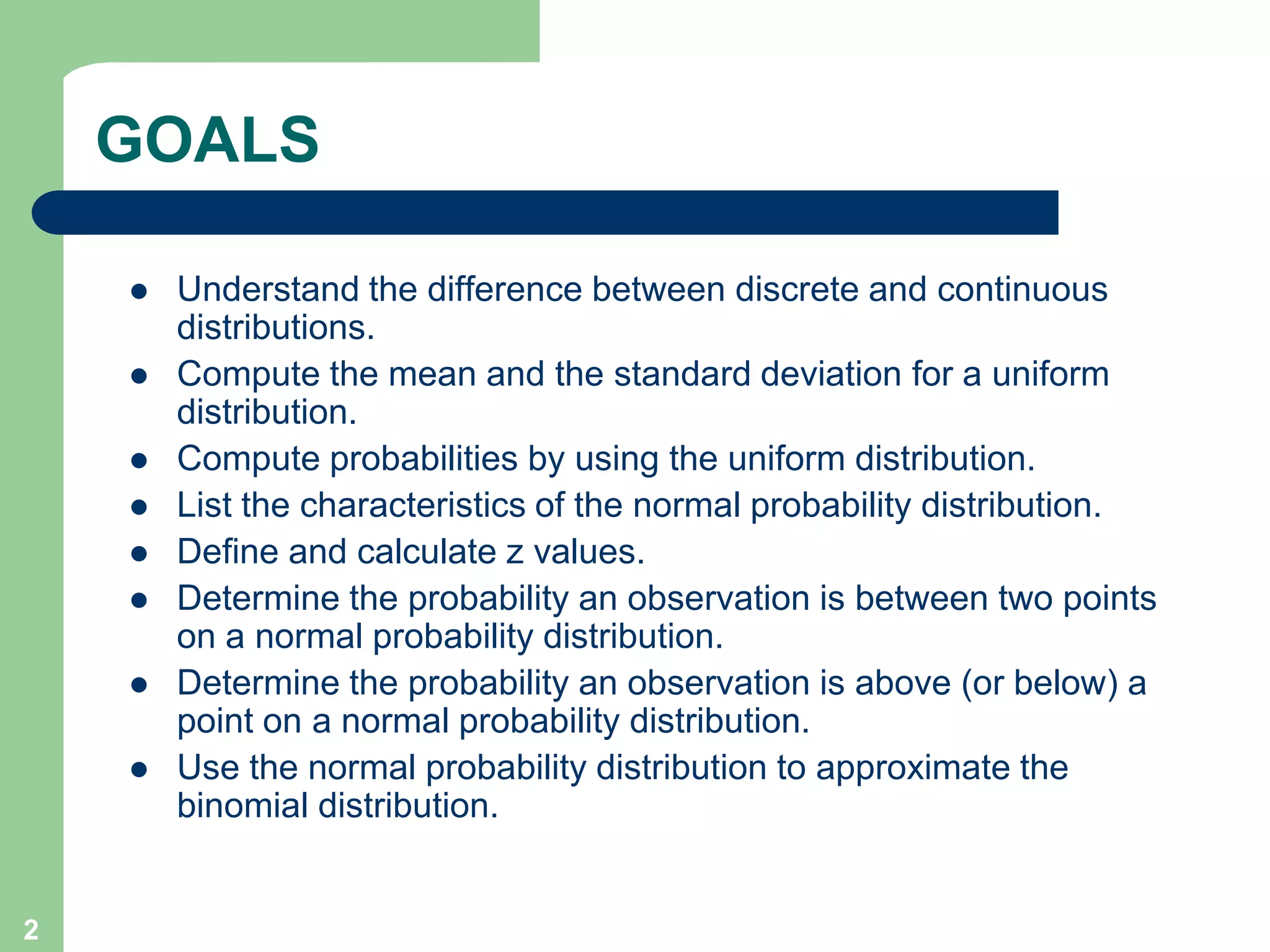 1) The document discusses concepts related to probability distributions including uniform, normal, and binomial distributions.