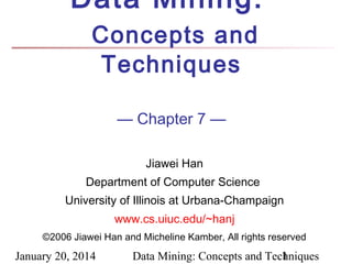 This document provides an overview of cluster analysis techniques. It discusses different types of data that can be used for cluster analysis, including interval-scaled, binary, nominal, ordinal and ratio variables. It also categorizes major clustering methods into partitioning methods, hierarchical methods, density-based methods, grid-based methods and model-based methods. Additionally, it covers measuring the quality of clusters, requirements for clustering in data mining, and calculating distances between clusters.