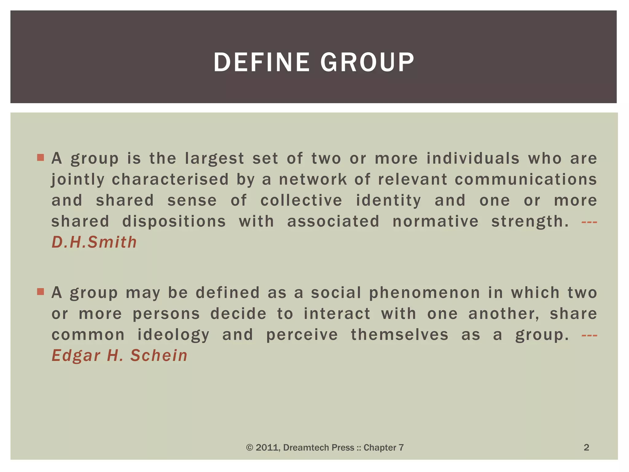 Groups and teams are important parts of any organization. A group is defined as two or more individuals who interact and share a collective identity. Groups form to fulfill members' needs for belongingness, support, security, recognition, and proximity. Both formal and informal groups exist in organizations. Team dynamics, properties like roles and norms, and concepts like groupthink must be understood to utilize groups and teams effectively. While groups focus on individual goals, teams emphasize mutual accountability and collective goals to produce outcomes through shared roles and responsibilities. The formation of cohesive and diverse groups and teams is crucial for organizational decision-making.