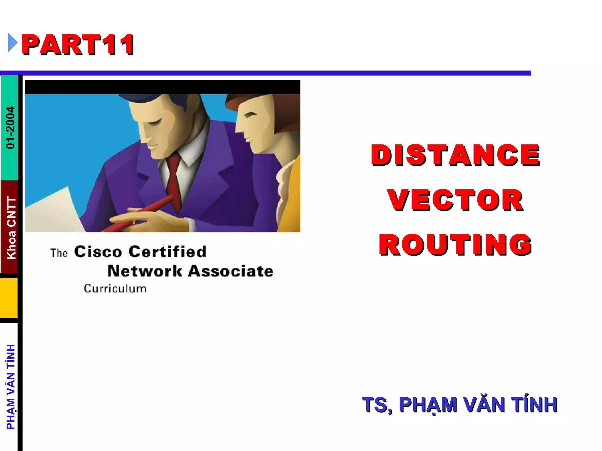 Distance vector routing protocols like RIP use hop count as the metric to determine the best path. This can lead to routing loops when routers continuously update each other with increasing hop counts, a problem known as "counting to infinity". RIP implements techniques like split horizon, holddown timers, and triggered updates to prevent this. The document goes on to describe how to configure and verify RIP, troubleshoot routing issues, and integrate static routes. It also provides an overview of IGRP configuration and verification.
