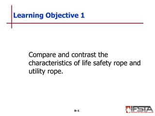 - Firefighters use ropes, webbing, and knots for tasks like hoisting equipment, search lines, stabilizing objects, and rescues. Different types of ropes and webbing have various characteristics and applications.