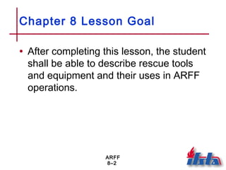 This chapter discusses rescue tools and equipment used in aircraft rescue and firefighting (ARFF) operations. It describes both hand tools and power tools used to cut, pry, and stabilize aircraft during rescue efforts. Safety is the top priority when using tools near flammable fuels or unstable aircraft. A variety of lifting, pulling and lighting equipment is also used to assist with rescues. Proper training is needed to safely use all rescue tools during ARFF operations.