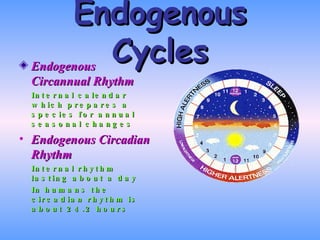 The document discusses the mechanisms of sleep and wakefulness, detailing endogenous rhythms such as circadian and circannual cycles managed by the biological clock in the hypothalamus. It outlines various sleep stages, disorders, and their symptoms, including insomnia, sleep apnea, and narcolepsy, along with potential treatments. Additionally, it presents theories on the functions and significance of sleep, particularly REM sleep in memory processing and cognitive function.