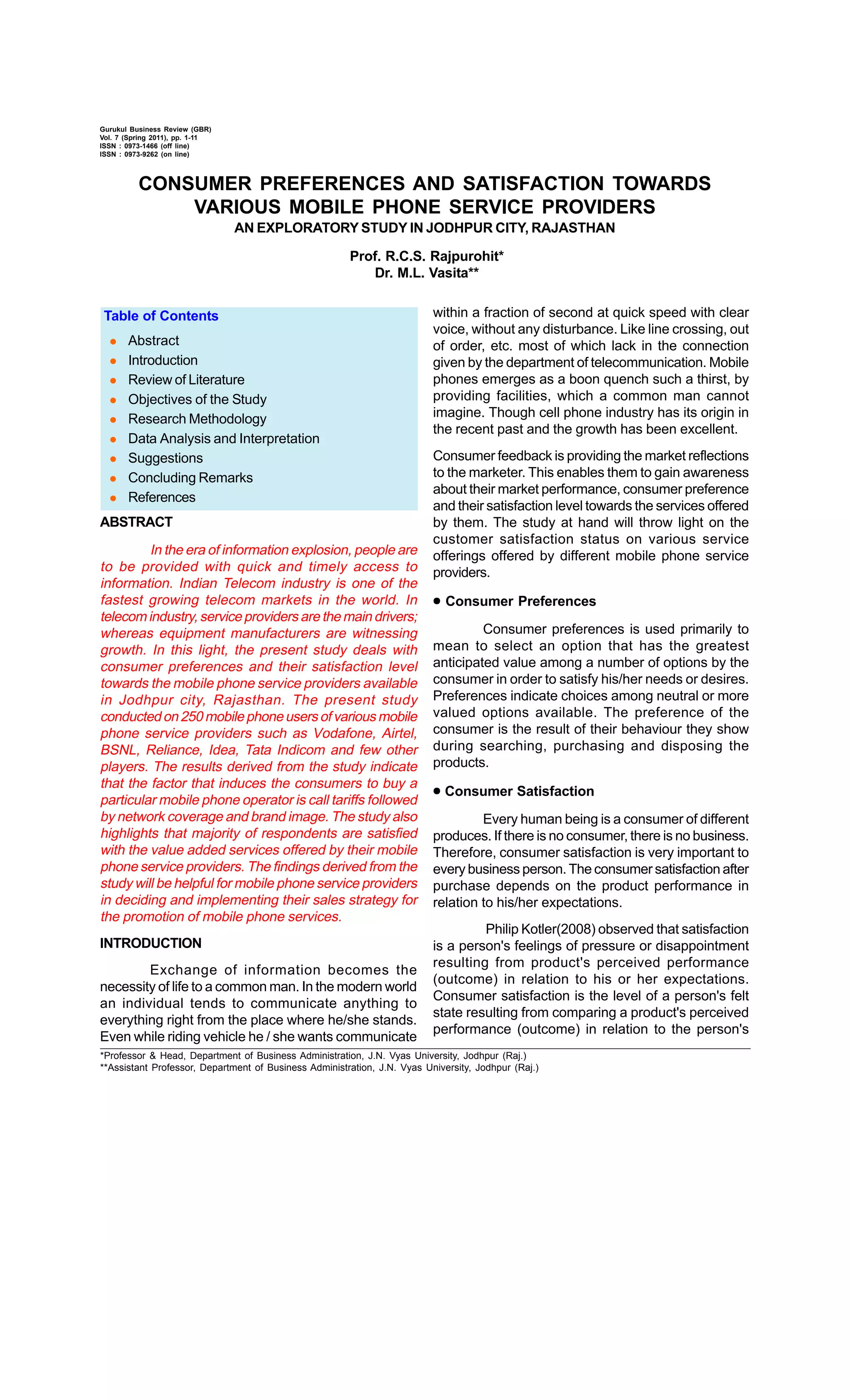 This document summarizes a study on consumer preferences and satisfaction towards various mobile phone service providers in Jodhpur City, Rajasthan. The study surveyed 250 mobile phone users of various service providers such as Vodafone, Airtel, BSNL, Reliance, Idea, Tata Indicom and others. The results showed that BSNL had the highest number of users at 36% followed by Airtel at 29.2%. Most respondents (84.4%) had prepaid plans, with BSNL and Airtel being the most popular prepaid providers. The key factors influencing choice of provider were found to be call tariffs, network coverage, and brand image, with family members