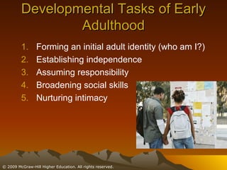 The document discusses various developmental tasks across different stages of life from early adulthood to older adulthood. It also discusses definitions of health, health promotion approaches, dimensions of health, and factors that influence behavior change. A new definition of health is proposed that focuses on one's ability to use intrinsic and extrinsic resources across different health dimensions to fully participate in life activities and feel a sense of well-being.