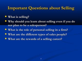 The document discusses personal selling and salespeople. It defines personal selling as oral communication with potential buyers to make a sale. Salespeople play key roles like identifying business opportunities, developing relationships, and providing customer solutions. Their activities include selling, servicing customers, and reporting. Effective salespeople have traits like motivation, customer knowledge, communication skills, and building long-term relationships. The rewards of a sales career are independence, financial benefits, and opportunities for advancement into management.