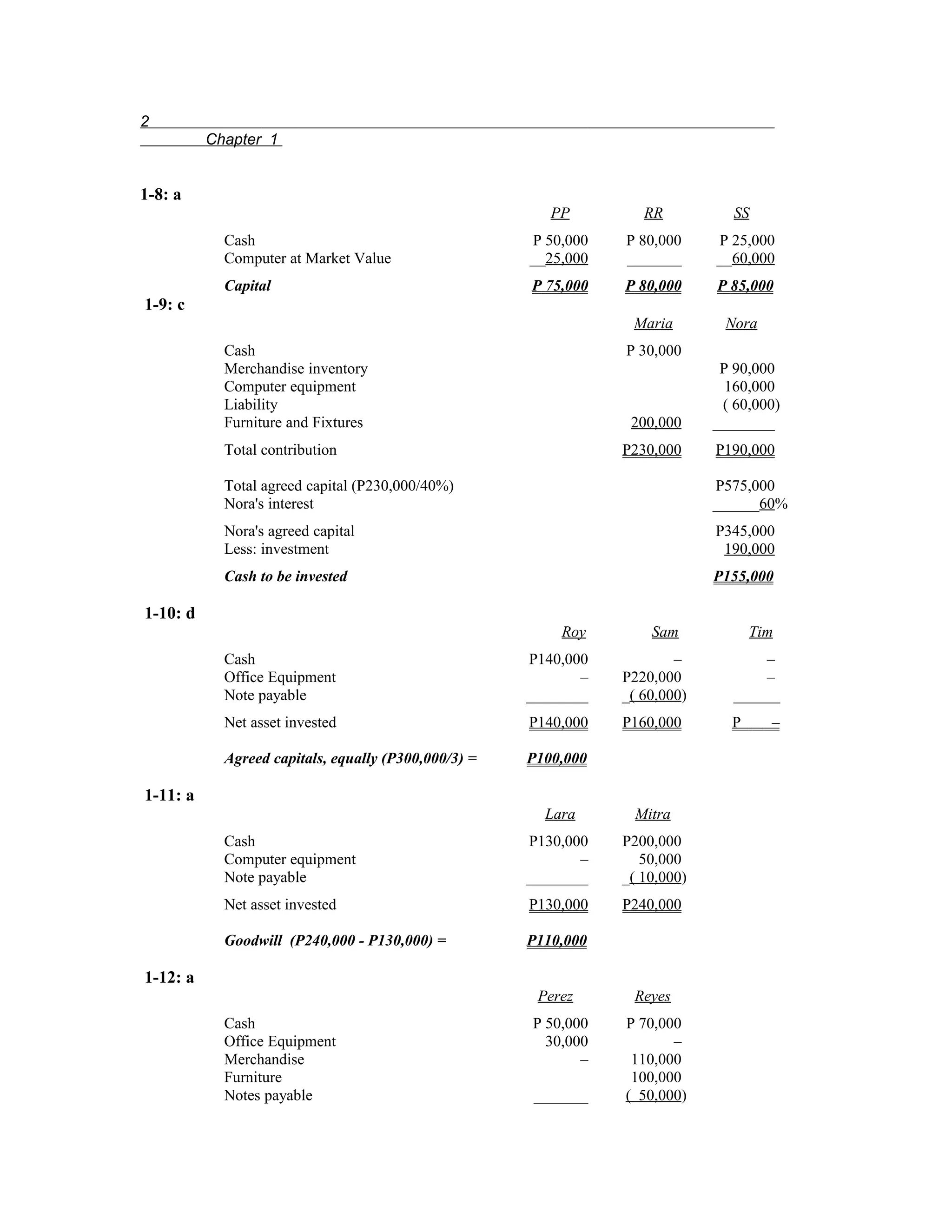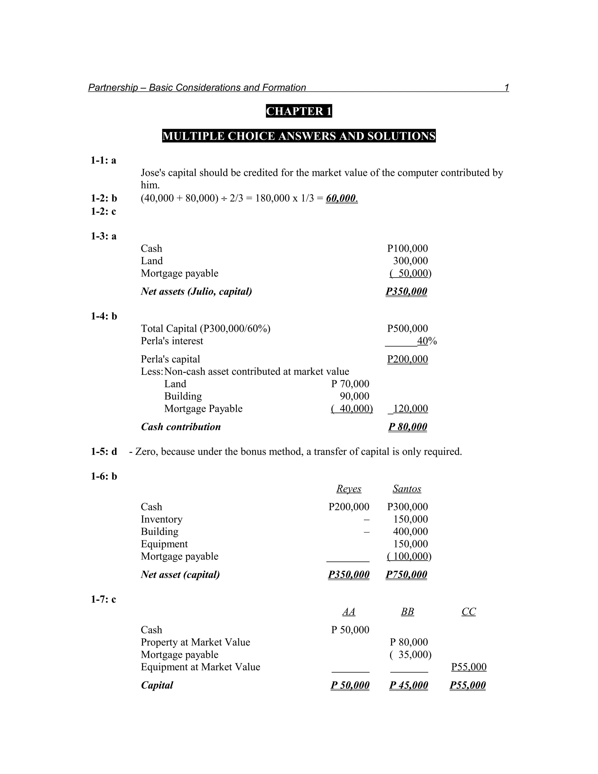 The document contains multiple choice questions and solutions regarding partnerships. It begins with 20 multiple choice questions testing concepts related to partnership formation, capital accounts, and capital contributions. The questions provide scenarios and ask the reader to select the correct answer. This is followed by solutions that show the accounting entries and calculations for each question.