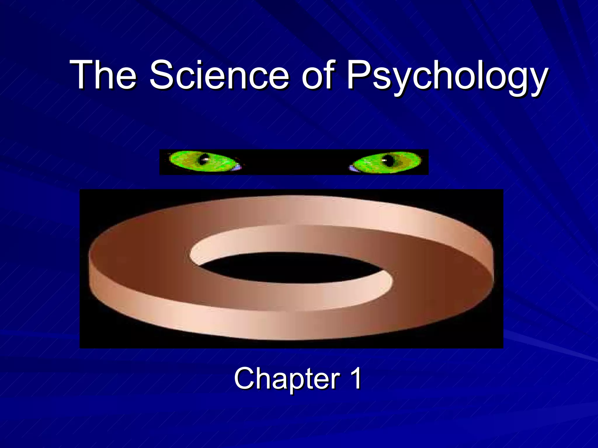 Psychology is the scientific study of behavior and mental processes. The goals of psychology are to describe, predict, explain, and control behavior. Early perspectives in psychology included structuralism, functionalism, Gestalt psychology, psychoanalysis, and behaviorism. Modern perspectives include the psychodynamic, behavioral, humanistic, biopsychological, cognitive, sociocultural, evolutionary, and other perspectives. Researchers use various methods including naturalistic observation, surveys, correlation, experiments, case studies, and more to study behavior scientifically while ensuring ethical treatment of participants. Critical thinking is important to evaluate psychological claims.