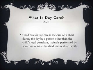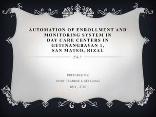 This document presents a study on automating the enrollment and monitoring system of day care centers in Guitnangbayan 1, San Mateo, Rizal. It begins with defining day care and providing a brief history of day care. It then states the problem, significance, scope and limitations of the study. The study aims to determine how helpful automation is for enrollment, data storage and retrieval. It also examines benefits in terms of time savings and student information management. The conceptual framework, research paradigm, methodology using quantitative surveys and t-tests, and instruments using checklists are described.